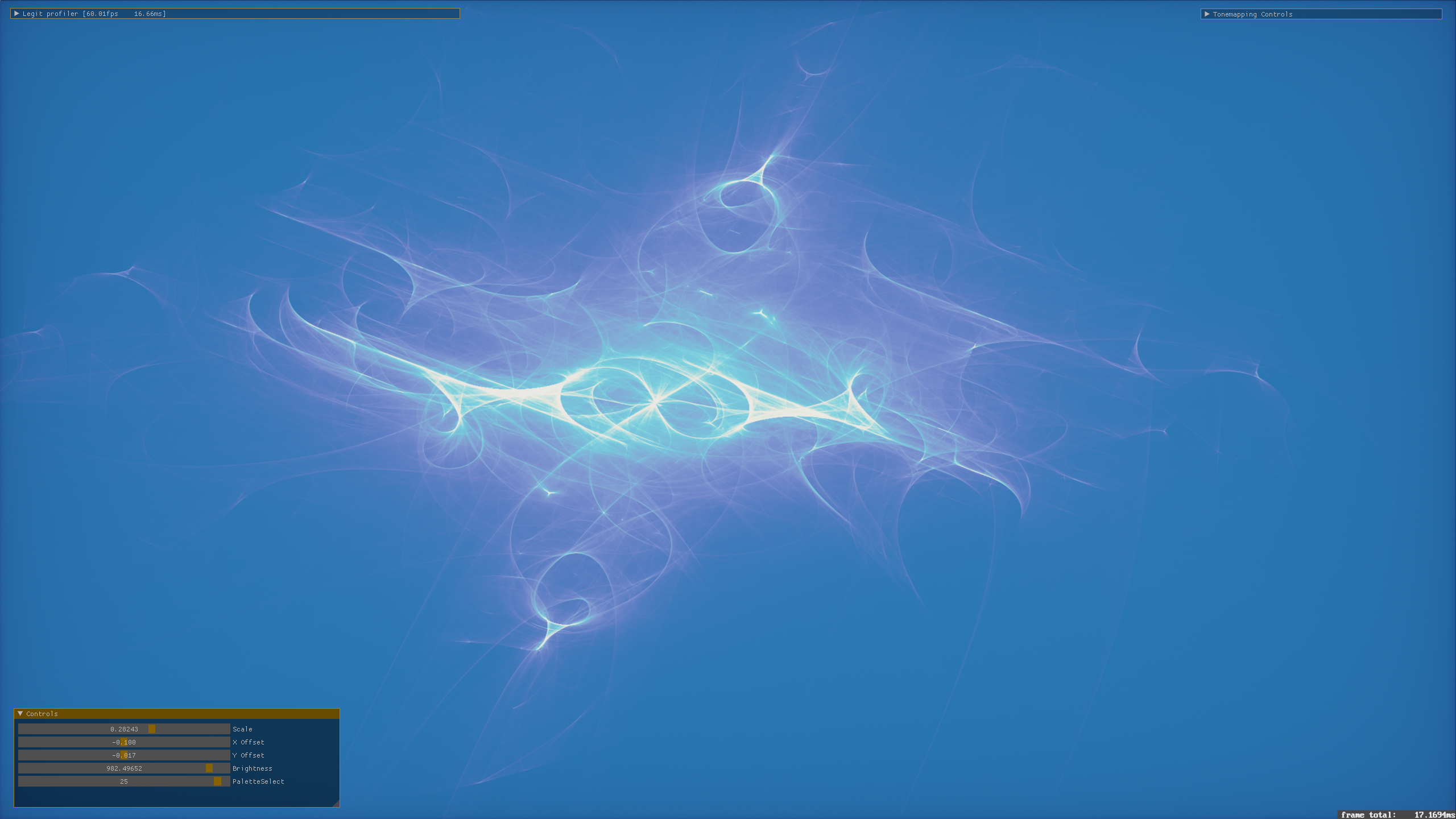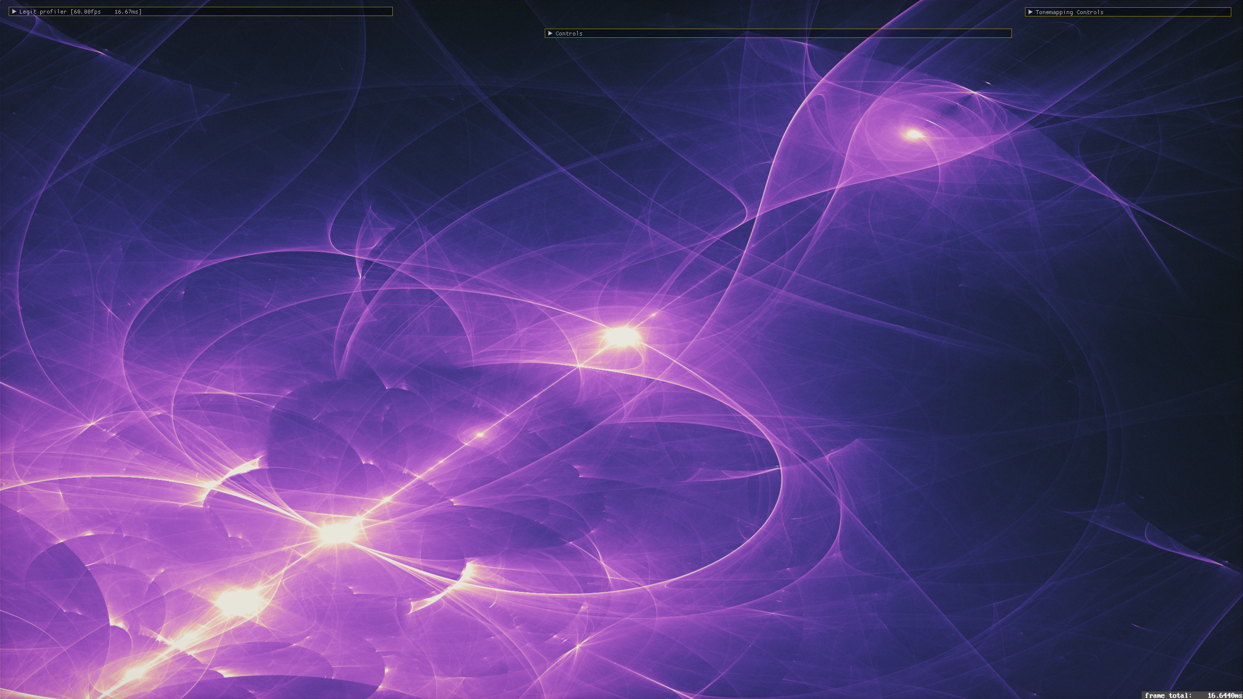 Some other implementation details - I started by doing this with a single R32UI buffer, doing atomic writes and maintaining an image-wise maximum value with atomicMax. Then, when prepping the image to display, you can normalize the values by dividing by the max and get everything in the range 0 to 1. From there, you can map the value to a palette quite easily, do brightness adjustments, raise the value to a power, things like this. That's pretty neat, but it lacks variation, solid color backgrounds, ends up looking kind of flat.